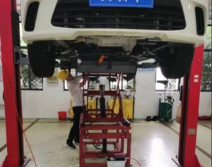 舉升車輛車身離地至1.7米左右(根據身高適合拆卸動力電池高度),落鎖并再次確定支撐平穩