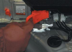拆卸維修開關(車輛若配置維修開關,佩戴絕緣手套,拆卸維修開關)