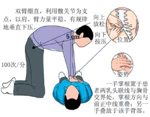 如果患者一開始就已經沒有脈搏,或者人工呼吸進行一分鐘后還是沒有觸及,則需進行胸外心臟按壓。施救者先要找到按壓的部位。沿著最下緣的兩側肋骨從下往身體中間摸到交接點,叫劍突,以劍突為點向上在胸骨上定出兩橫指的位置,也就是胸骨的中下三分之一交界線處,這里就是實施點。施救者以一手疊放于另一手手背,十指交叉,將掌根部置于剛才找到的位置,依靠上半身的力量垂直向下壓,胸骨的下陷距離約為4~5厘米,雙手臂必須伸直,不能彎曲,壓下后迅速抬起,頻率控制在每分鐘80~100次。